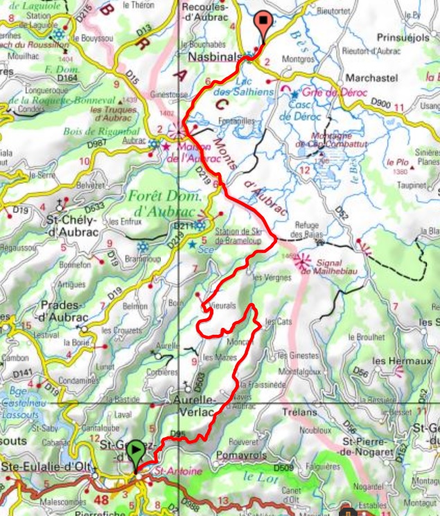 Je vous ai tracé le parcours depuis Saint-Geniez d'Olt (12) jusqu'à Nasbinals (48). Vous pouvez vous déplacer